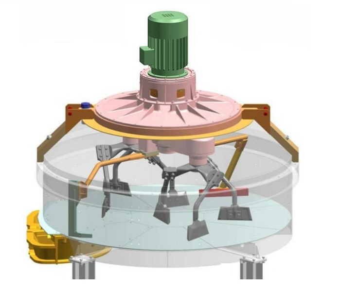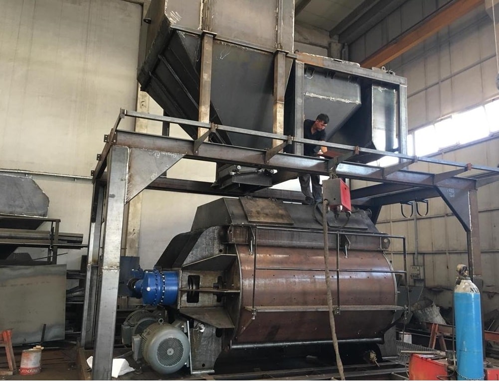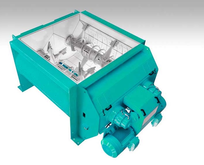 Mixing of the product takes place using 2 parallel axes equipped with levers and bolt-on blades made of cast Ni-Hard steel. The movement of the mixing parts is provided by one or more electric motors combined with gearboxes and torque dividers moving on two shafts.